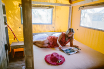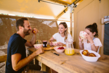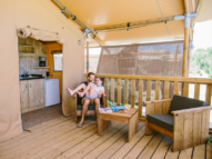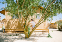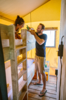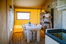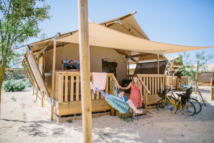 Cette tente de charme vous accueille en bordure d’une zone naturelle : Composée d’une chambre parentale et d’une chambre avec 2 lits superposés, d’un séjour/cuisine (plaques électriques, évier avec eau froide, réfrigérateur table-top, cafetière et rangement). Le hamac, installé sur la terrasse en bois, couverte, vous invitera au farniente… Tout est prévu pour votre confort : draps et serviettes de toilette à disposition ainsi que 2 vélos dont un équipé d’un siège enfant.